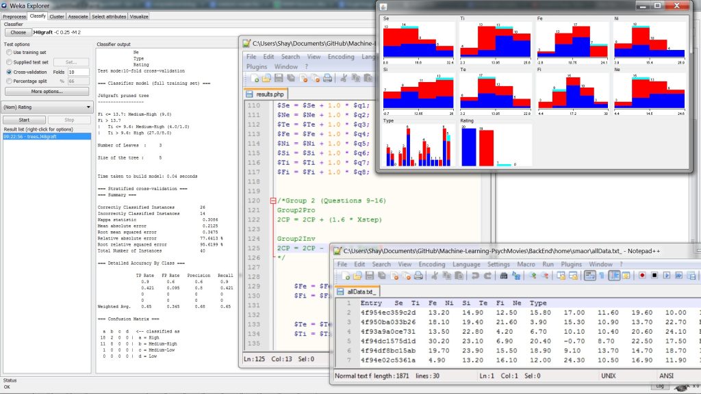 Senior design project that implemented data mining techniques and a psychological assessment test (MBTI) to discover correlations and predictive models on movie preferences. Primarily, using numerical quantification of the 16 cognitive functions underlying the MBTI to find correlation with sub-genres using a J48 decision tree-inducing algorithm under Weka Machine Learning software. The J48 algorithm is Weka’s implementation of the C4.5 algorithm by Ross Quinlan.