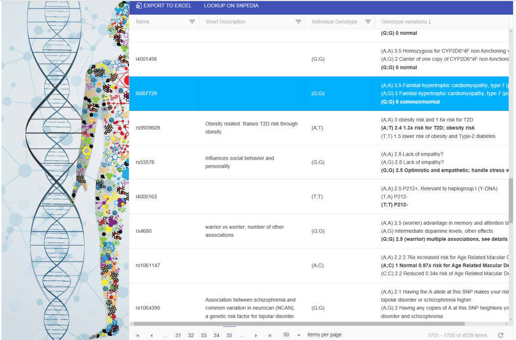 OS Genome is an open source web application that allows users to gather the information they need to make sense of their own genome without needing to rely on outside services with unknown privacy policies. OS Genome’s goal is to crawl various sources and give meaning to an individual’s genome. It creates a Responsive Grid of the user’s specific genome. This allows for everything from filtering to excel exporting.