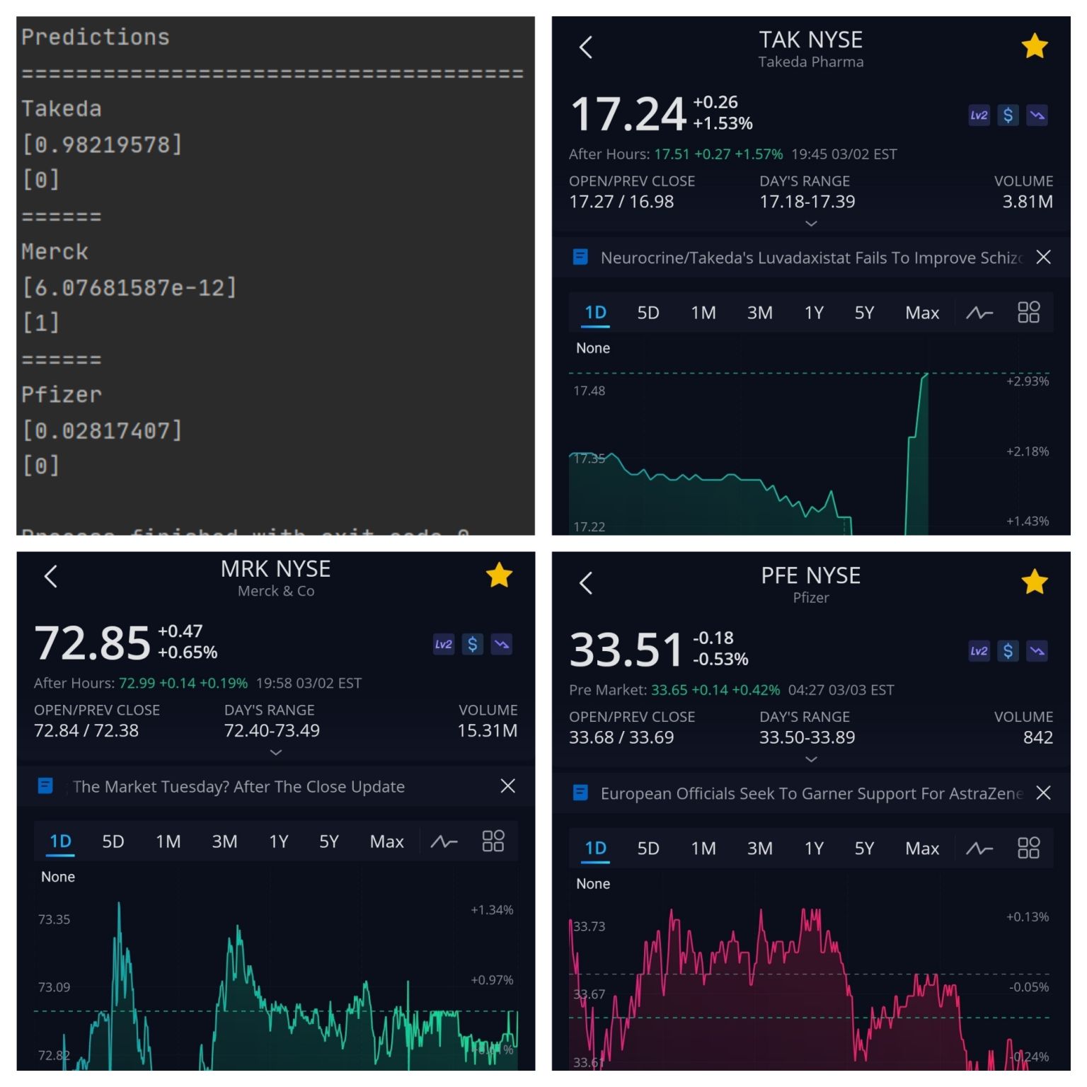 Python script leveraging SQL Alchemy to aggregate and analyze data from the SQL Server I set up on AWS Linux Cloud and a Neural Network using Linear Regression and Sigmoid Function to predict stock market behaviors. Pictured above is the Prediction Algorithm predicting loses for Takeda and Pfizer, and gains for Merck. Takeda had losses after hours, with the prediction accounting for news aggregated after market hours